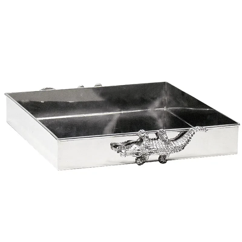 Het dienblad heeft een chique zilveren kleur en is gemaakt van hoogwaardig metaal. Het is voorzien van prachtige etsen in de stijl van een krokodillenhuid, waardoor het een unieke uitstraling heeft.